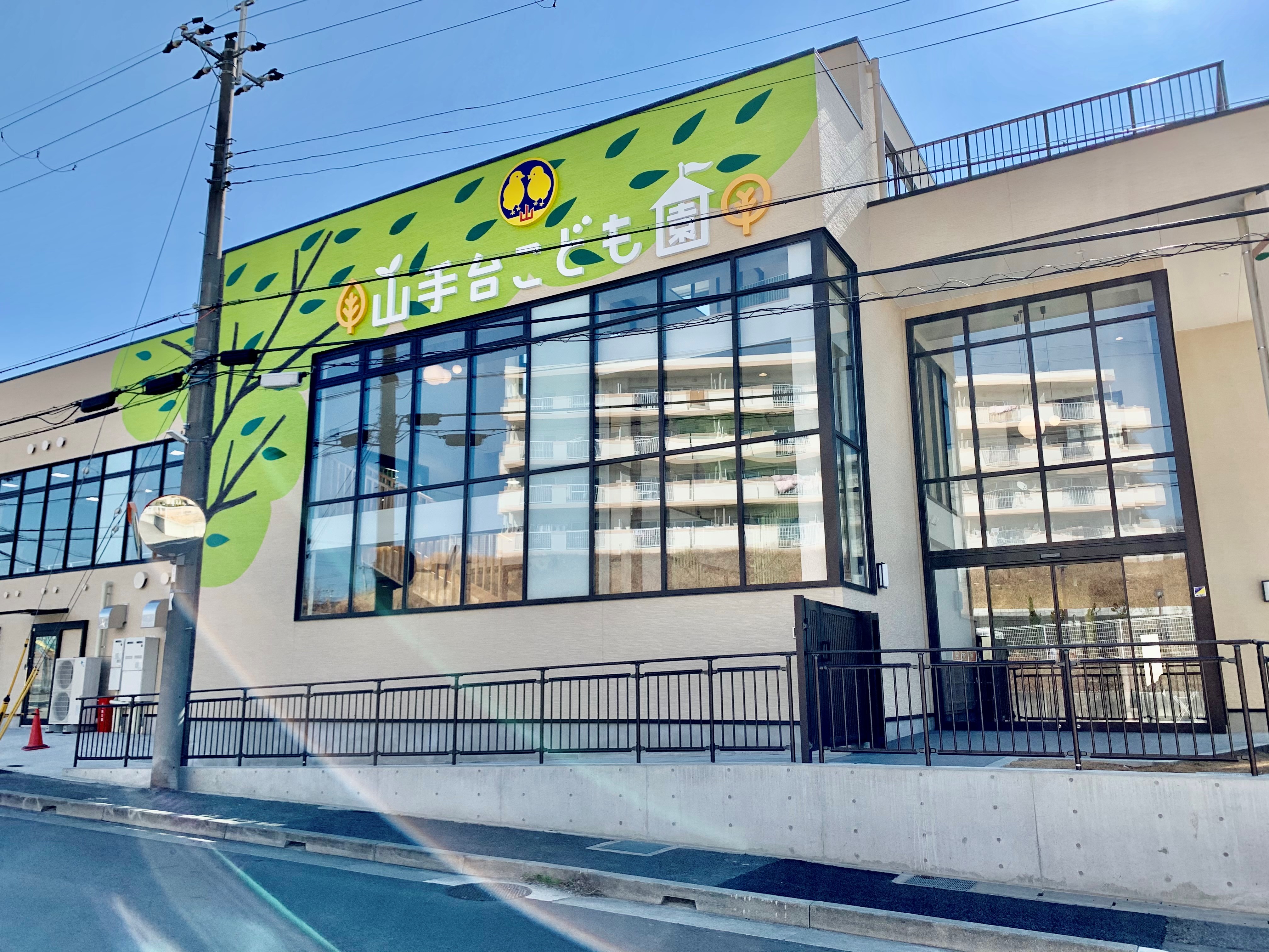 山手台こども園の新しい園舎です。北側に面する壁には窓ガラスが大きくとられ、暖かな日差しが園舎内にあふれます。
