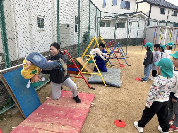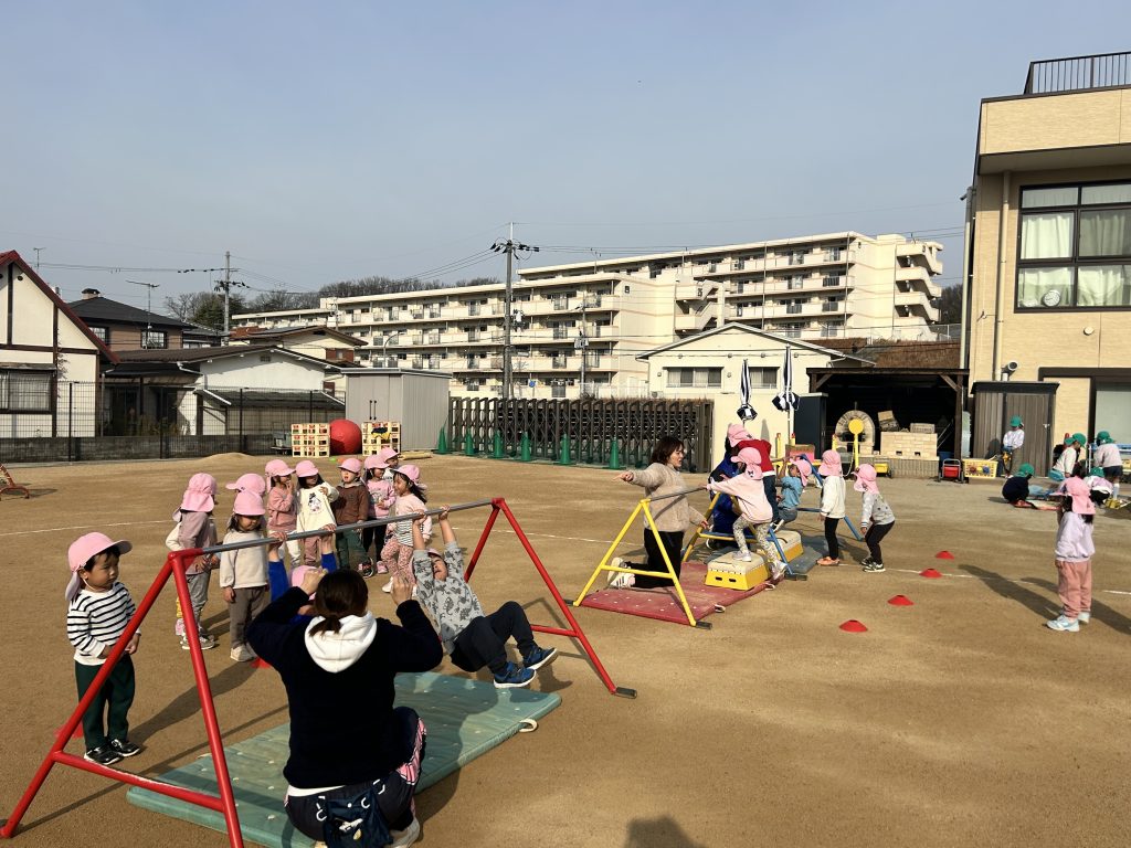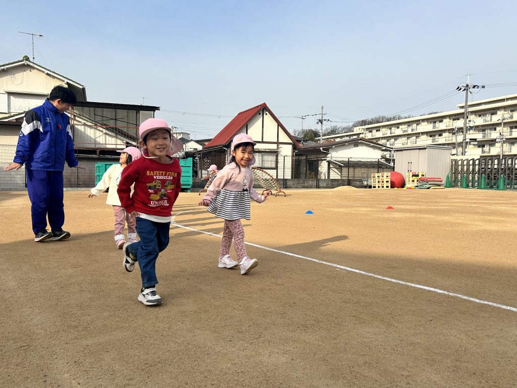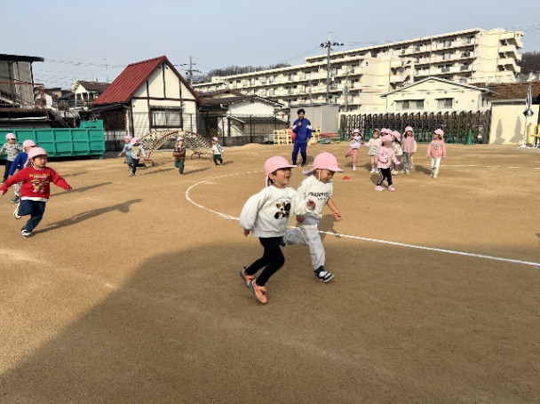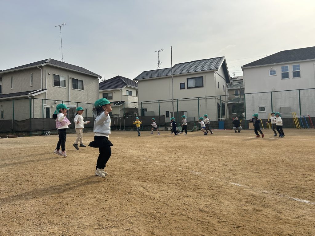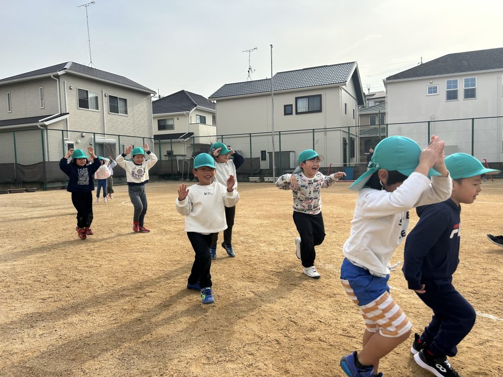 園庭を走るのも子ども達が楽しく走れるように、カニやペンギンなど色んな動物の真似っこをしながら楽しそうな笑い声とともに走っていましたよ🏃🎶