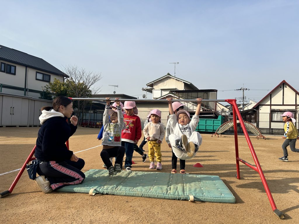 鉄棒につかまってしっかり両足を浮かせて、ぶ~らぶら🎶