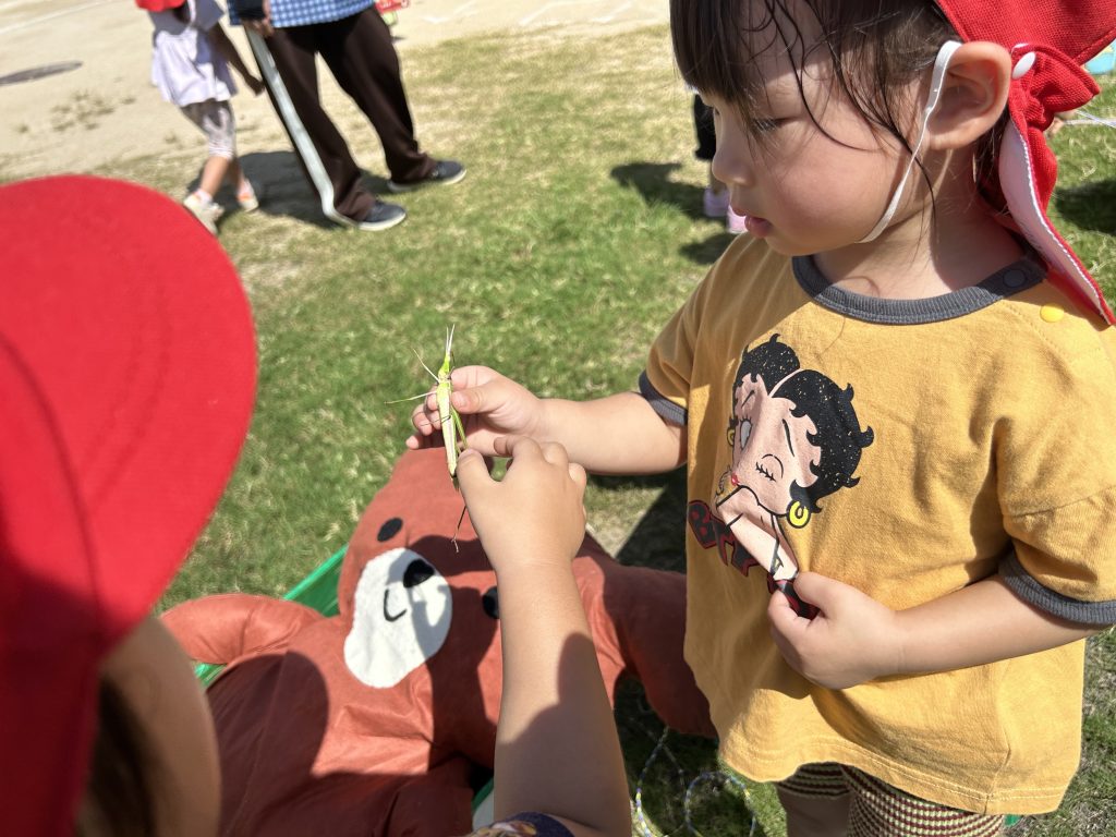 大きなバッタを上手に持ちながら右手で服を握っているところが緊張感が伝わります💓