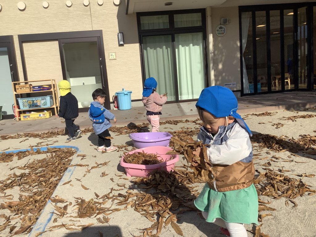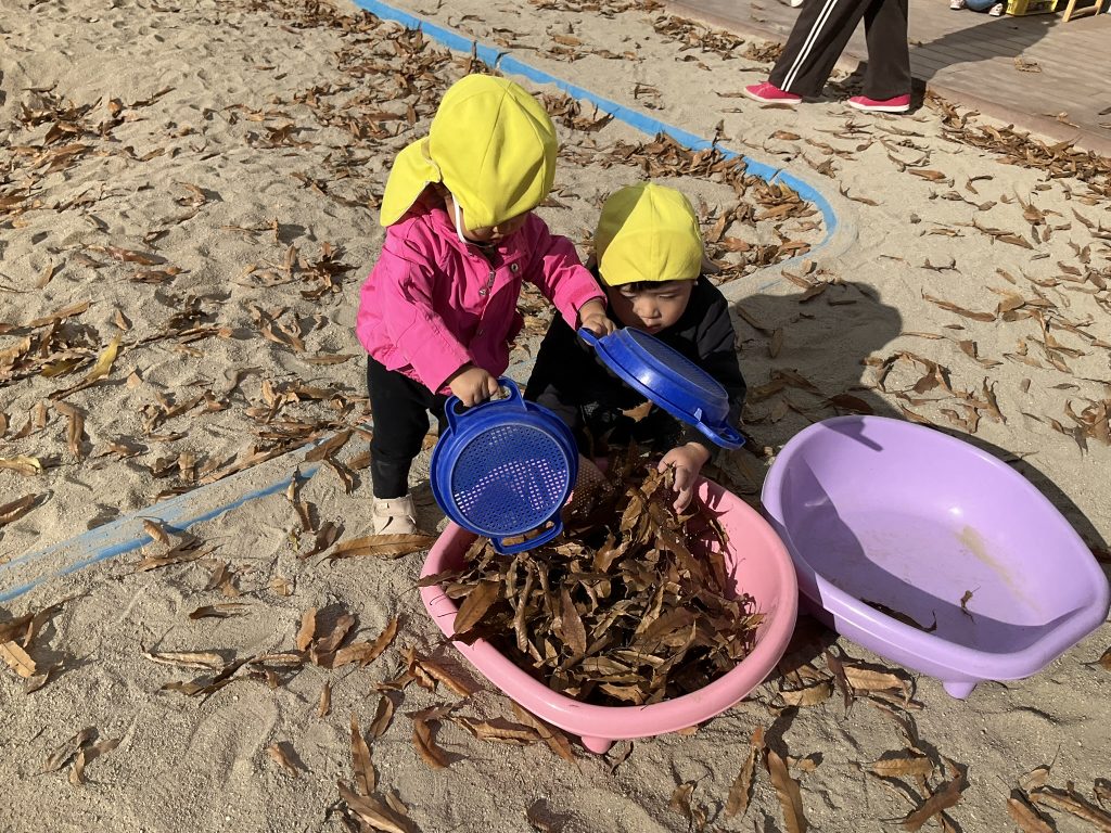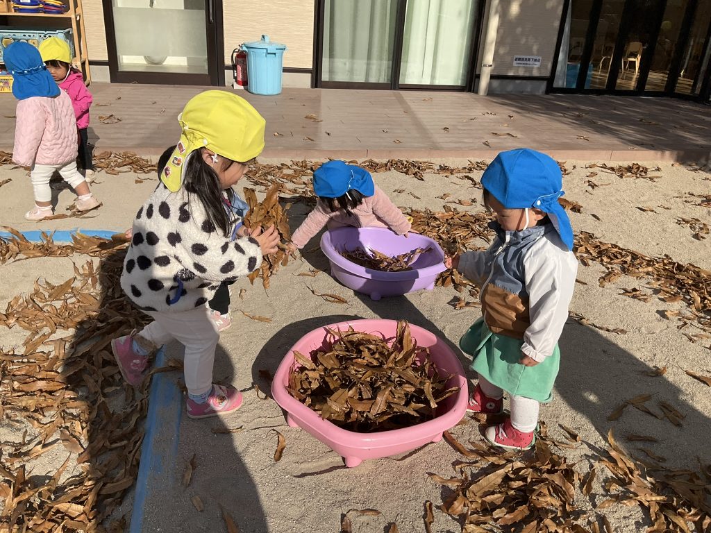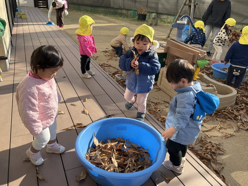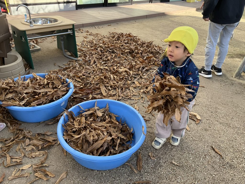 たらいが落ち葉でいっぱいになっていくのも面白くて夢中になってしまします🎶